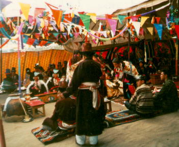 Nuz a v zakulisi sa permanentne podava obcerstvenie (jedlo a samozrejme a pitie). Dominuje tu Chang (buclata nadoba v lavo) spica himalajsky alkohol. Vyrabaju ho z kvaseneho obilia. Nasype sa donho muka a popija sa. Je slabsi ako nase pivo, ale v tejto vyske s vami narobi divy ... |