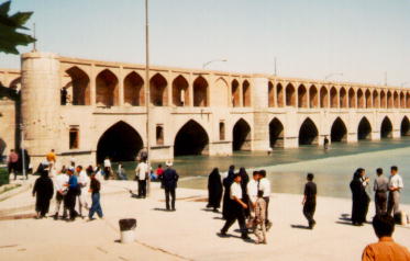 Most cez rieku v Esfahane. Ich velmi cenna pamiatka. Na prizemi mostu su same fajciarne. Vsade zeny v ciernom (casto su priktyte od hlavy po paty a na ociach maju len taku trochu redsiu sietovinu) ,my samozrejme tiez v dlhych nohaviciach (cudnost a podobne ...), tj. idealne oblecenie do horucav.... mysleli sme si. Ale ono to kym je suchy vzduch celkom dobre funguje. |