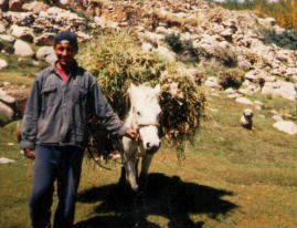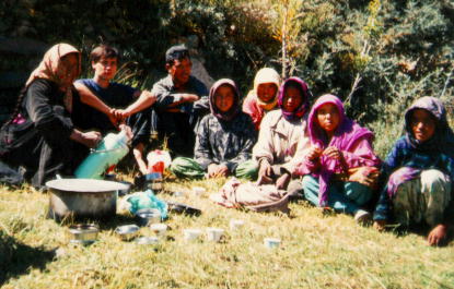 Obed na poli. (druhy z lava som Ja) 5 dievcat vpravo su robotnicky najate na kosenie. V ladakhu sa kosi zasadne iba kosakom a to tak, ze druhou rukou sa trs travy pridrza, aby ste ho mohli odseknut uplne pri koreni. Jasne, ze to ide pomaly, ale setria, kde sa da. A na tych klukatych polickach sa kosa vacsinou ani nezmesti.. Ej veru nakosil som sa tu travydost... Uff.. |