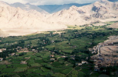 Pohlad na horny koniec zelenej casti Lehu. Dolina pokracuje smerom k nasej dedine, kde sme neskor jeden mesiac byvali v rodine.To sme uz ale boli iba 2, jeden musel pre zdravotne tazkosti odletiet ( Hnacky, vyskova choroba). Nuz Leh je vo vyske 3500m.n.m a tak za nehra o fazulky ... |
