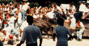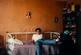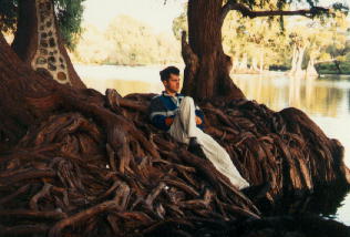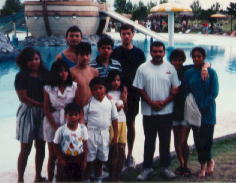 Na tejto tmavej a bohuzial nezretelnej fotke som ja (4. z prava) s mojimi znamimi na plazovom kupalisku. ( v pozadi vidno bazen pre deti, v strede ktoreho bola piratska lod) |